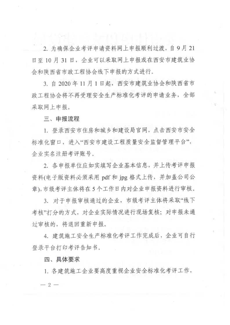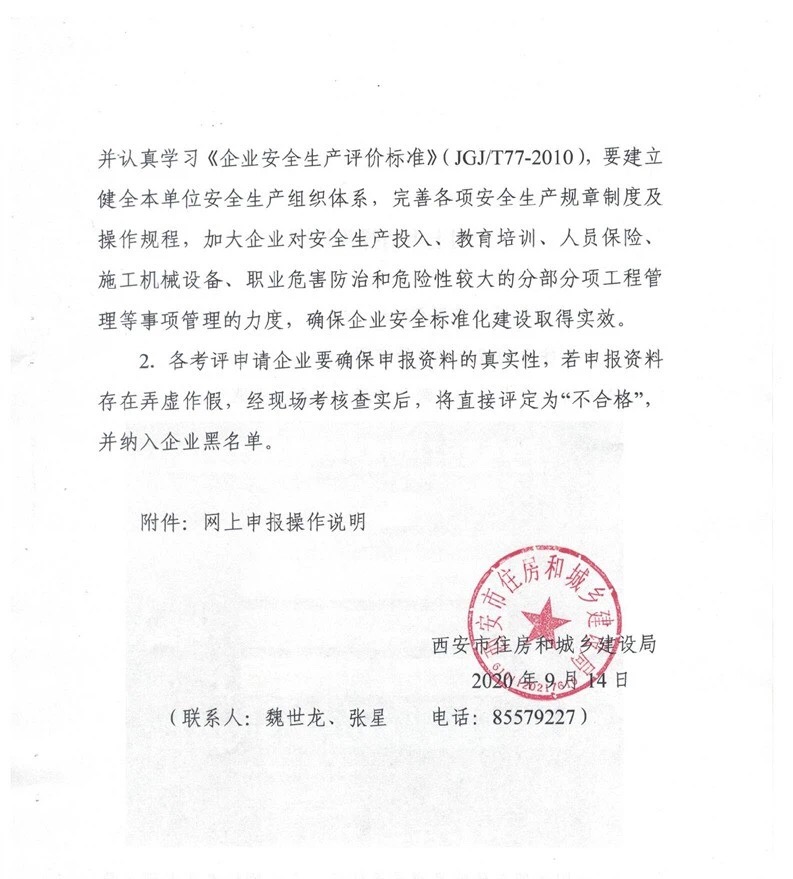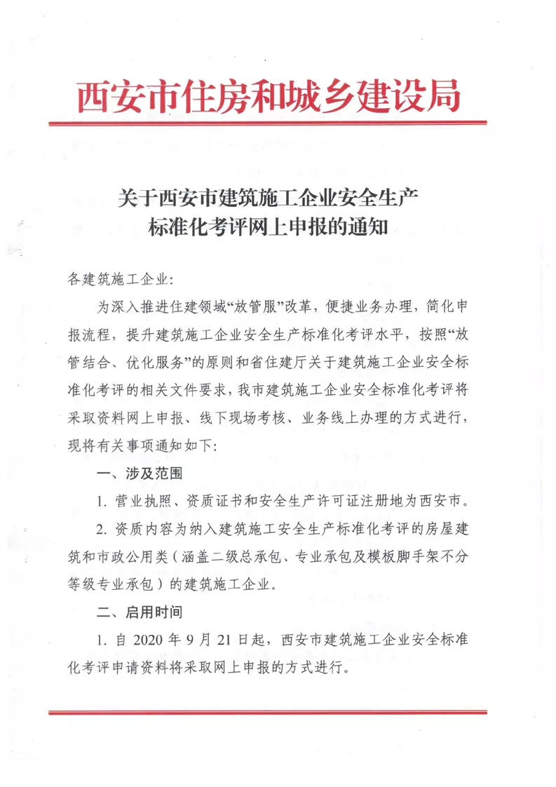 “ 9月15日,西安市住房和城鄉(xiāng)建設局發(fā)布關于西安市建筑施工企業(yè)安全生產標準化考評網上申報的通知。”